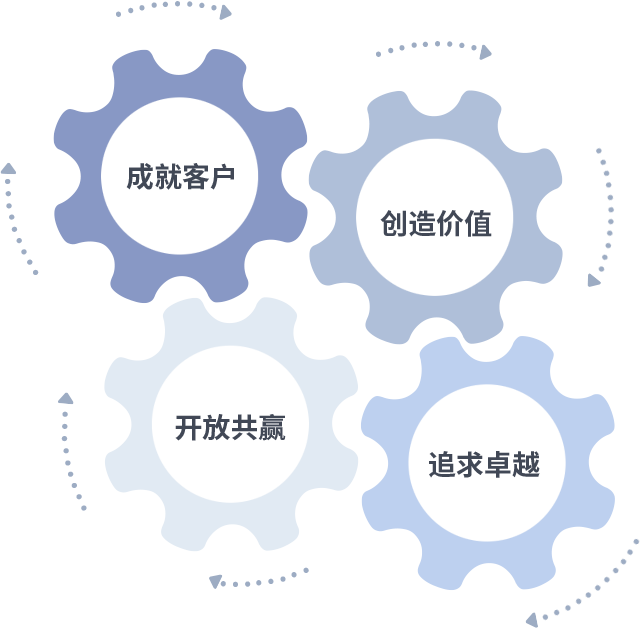 成就客户是一切决策的出发点,创造价值是衡量所有工作的标准,追求卓越是CQ9电子做事做人的态度,开放共赢是CQ9电子的格局也是最终的结果。价值观的齿轮环环相扣,推动着组织里的每个人不断向前。